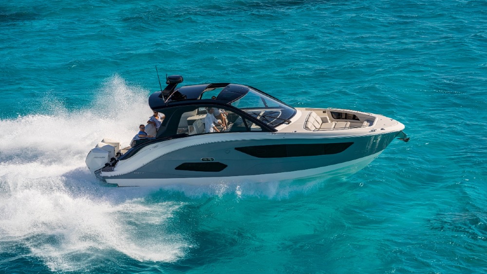 Although traditionally express cruisers have not featured outboard engines, this is changing rapidly. Among the best sports cruisers brands there is Four Winns, Sea Ray, Sabre, Tiara, Prestige, Hunt, Riva, and many more. Our selection is the Sea Ray Sundancer 370 outboard, which has joystick piloting, triple Mercury 300 Verado outboards and is super fast. This cruiser has a length of 39′ 9″ / 12.12 m, beam of 12′ / 3.66 m and weight of 21,008 lb / 9,529 kg.